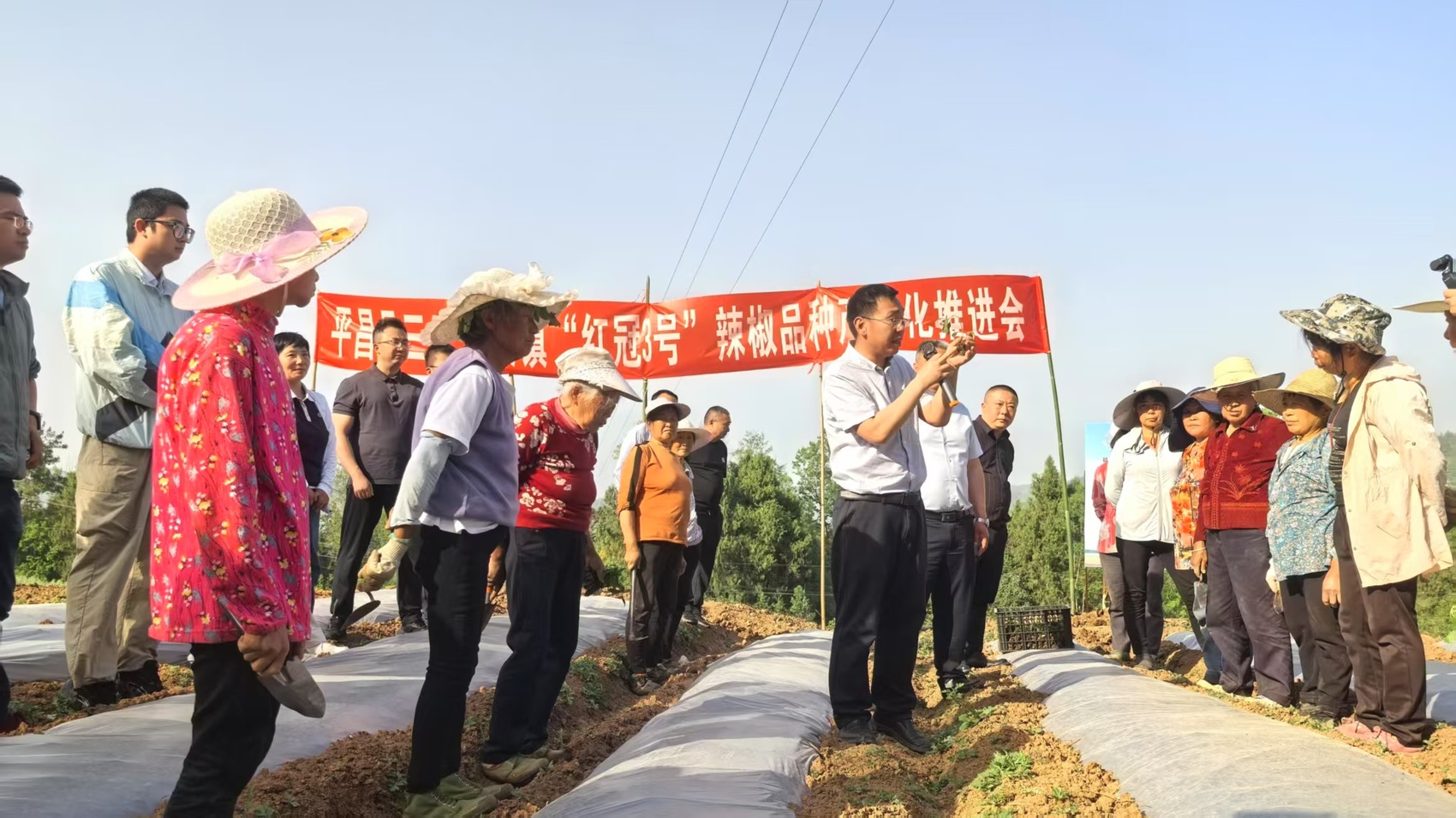 有了好品种打基础,还需要标准化种植、管护才能确保好品质。当天,三十二梁镇组织全镇党总支书记及产业发展带头人前往柳林村观摩专家技术要点培训。下栽深度10cm至15cm合适、最下端两片叶子不能埋入土壤、定根水需要配合杀菌药剂⋯⋯专家实地讲解、示范后,村民们现场栽种、专家现场提供指导。