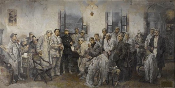 比如,“遵义会议”这个选题,彭彬、刘向平的作品都富有想象性地把与会人员放在会址二楼的过道上。刘向平的作品还通过会间休息的生动描写,反衬这个决定了红军命运的会议是如此的凝重。这两幅画面的会外场景描写,都是画家艺术想象的虚构,甚至两幅作品还隐现了不同时代的审美视点。就正面描写而言,人们印象最深的无疑是沈尧伊创作的《遵义会议》。此作看似描写会议场景,但绝不是真实会议的再现,而是以会址现场为背景进行绘画独特的艺术再现——群体肖像创作。如果说,这幅画作最富有历史的真实质感,是因为作者半生为创作连环画《地球的红飘带》而多次重走长征路,积累了大量丰富的视觉素材,而使画面上的每个历史人物都符合他们特定的身份形象,甚至主席抽烟的动作及烟盒商标的细节。这幅画作的主题,还通过人物排列的中心与非中心、表情与情态、人物性格与体态造型,以及墙壁上的马克思像与窗外黑沉的夜色等设计,暗示遵义会议作为中国革命的转折点所表达的将马克思主义与中国实践相结合的这一深层寓意。