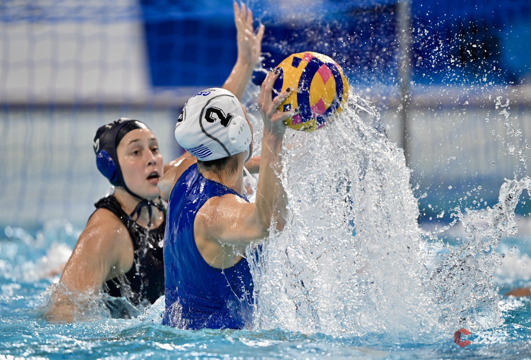 希腊队(白色泳帽)战胜意大利队(黑色泳帽)。