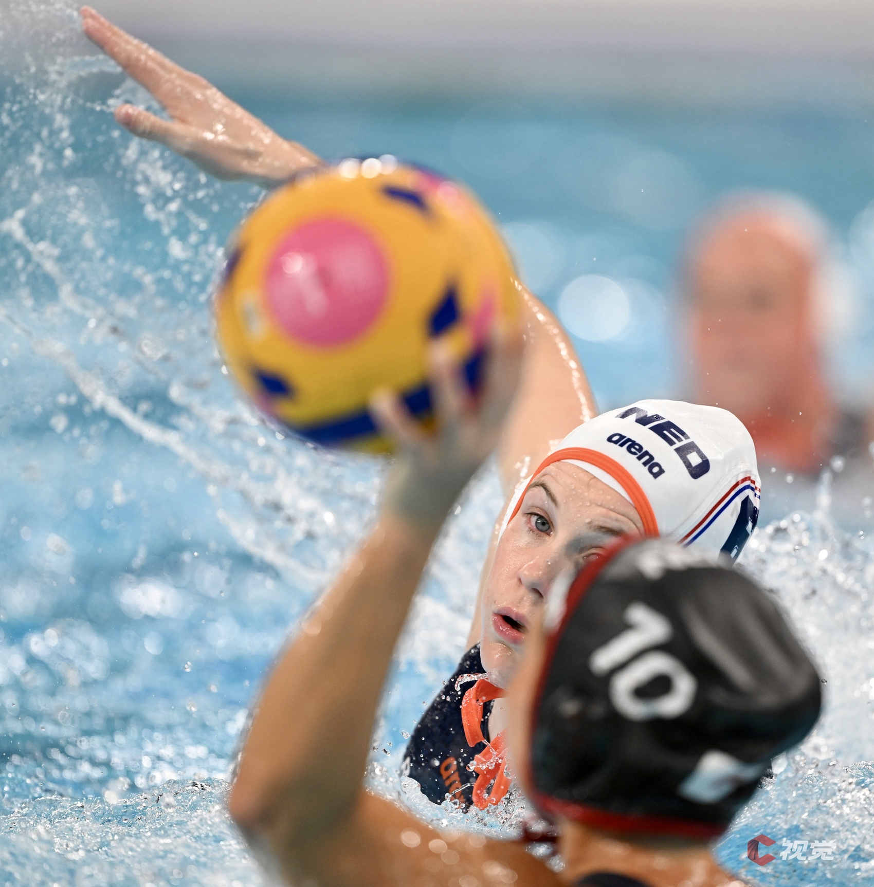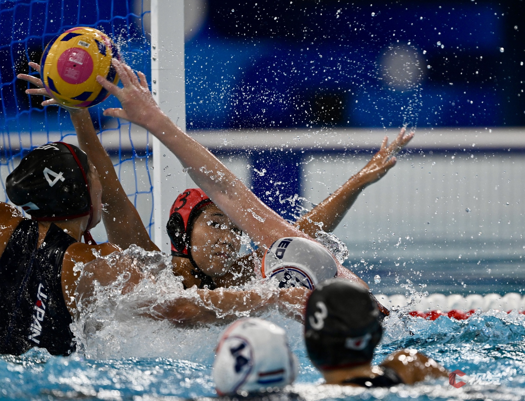 荷兰队(白色泳帽)战胜日本队(黑色泳帽)。