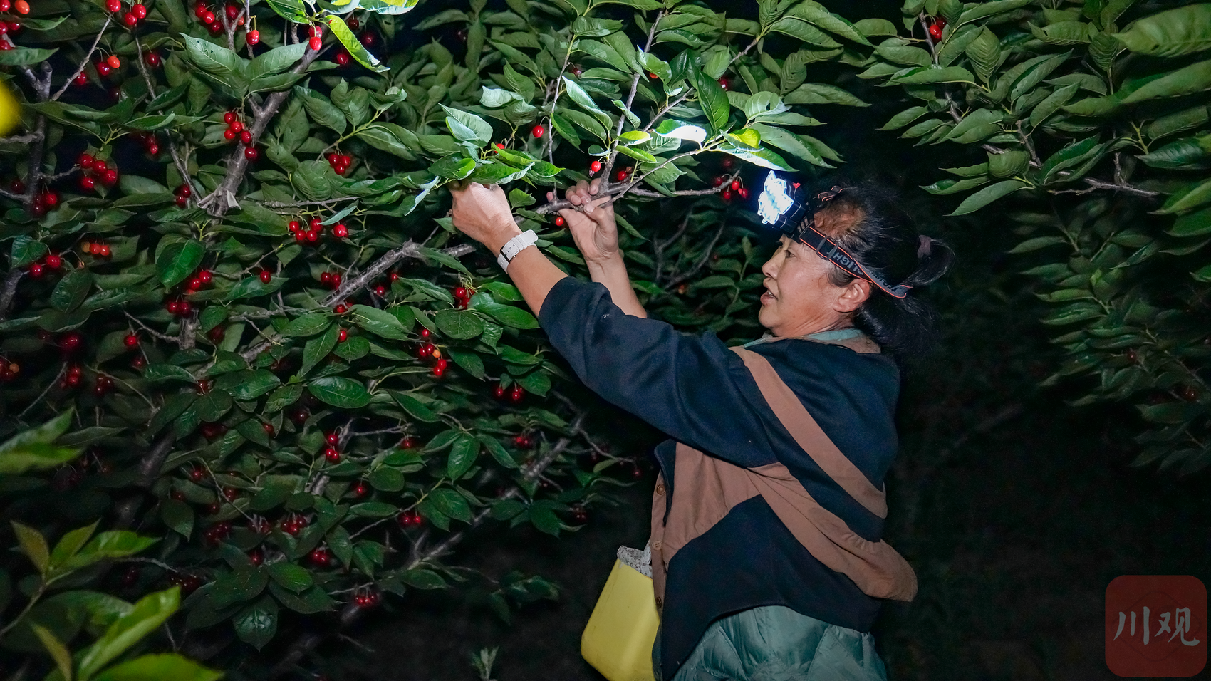“干脆不吃饭,摘了下来吃,赶着送走。”听着邻居们的动静,盘下50多亩樱桃地的52岁村民赵富美抓起头灯、驾着皮卡车,开向山顶,采摘工人罗都能随后跟来。4天前,他们兄弟三人带着摩托车,从盐源县树河镇坐船赶来。每年樱桃将熟时节,他们就外出帮人摘樱桃,同村出来的还有20余人。除了罗都能,赵富美还从隔壁会理市叫来5个熟手,包吃包住,每天工钱150元。