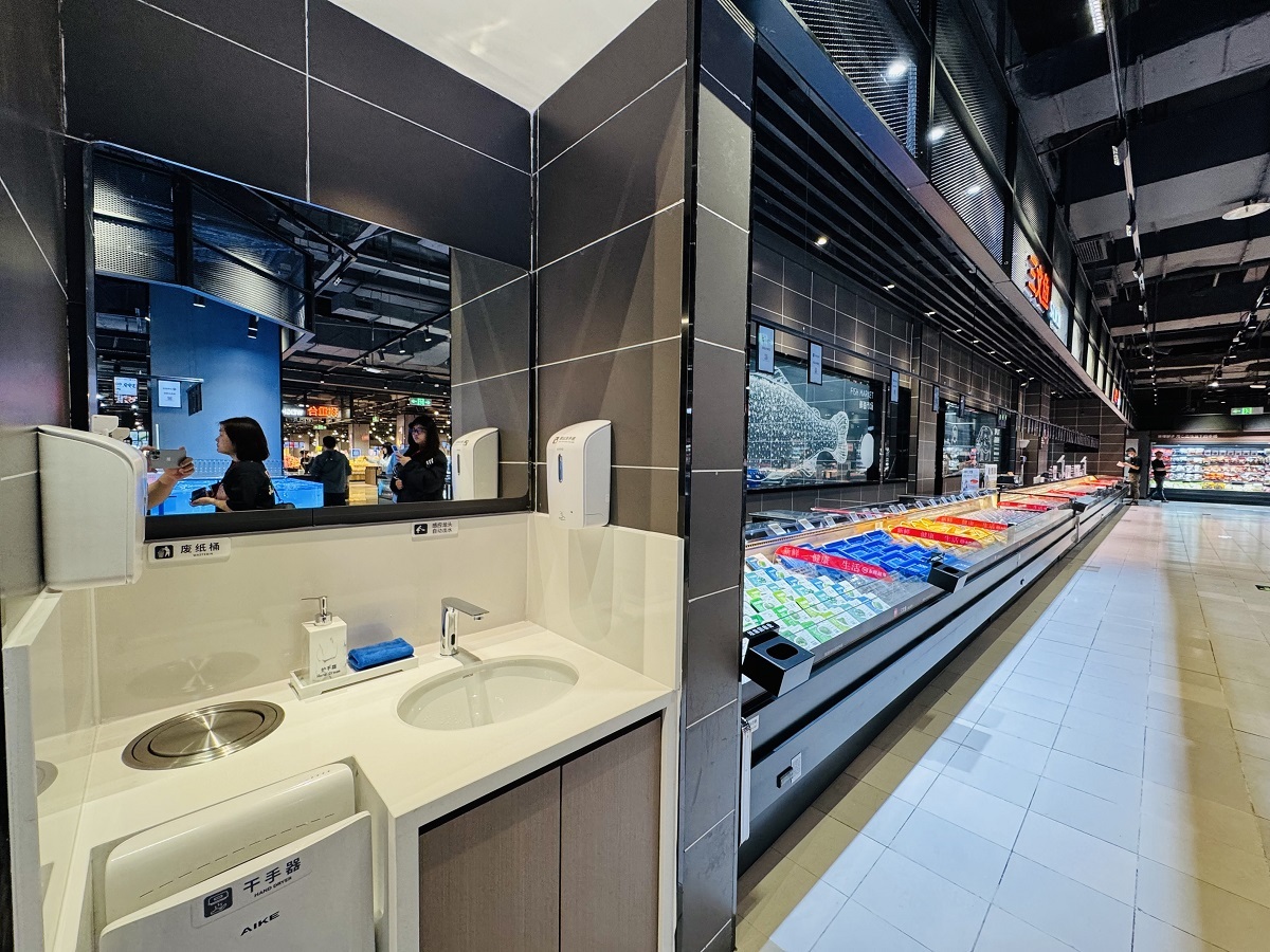 走进卖场,最宽约5米、最窄不低于2米的通道可同时让4辆购物车并排行进;1.6米高的中岛货架让小朋友们也能自由挑选商品;顾客休息区内,洗手池、微波炉、直饮机等服务设备洁净光亮;宠物安置区内软垫、一次性尿垫等设施一应俱全。