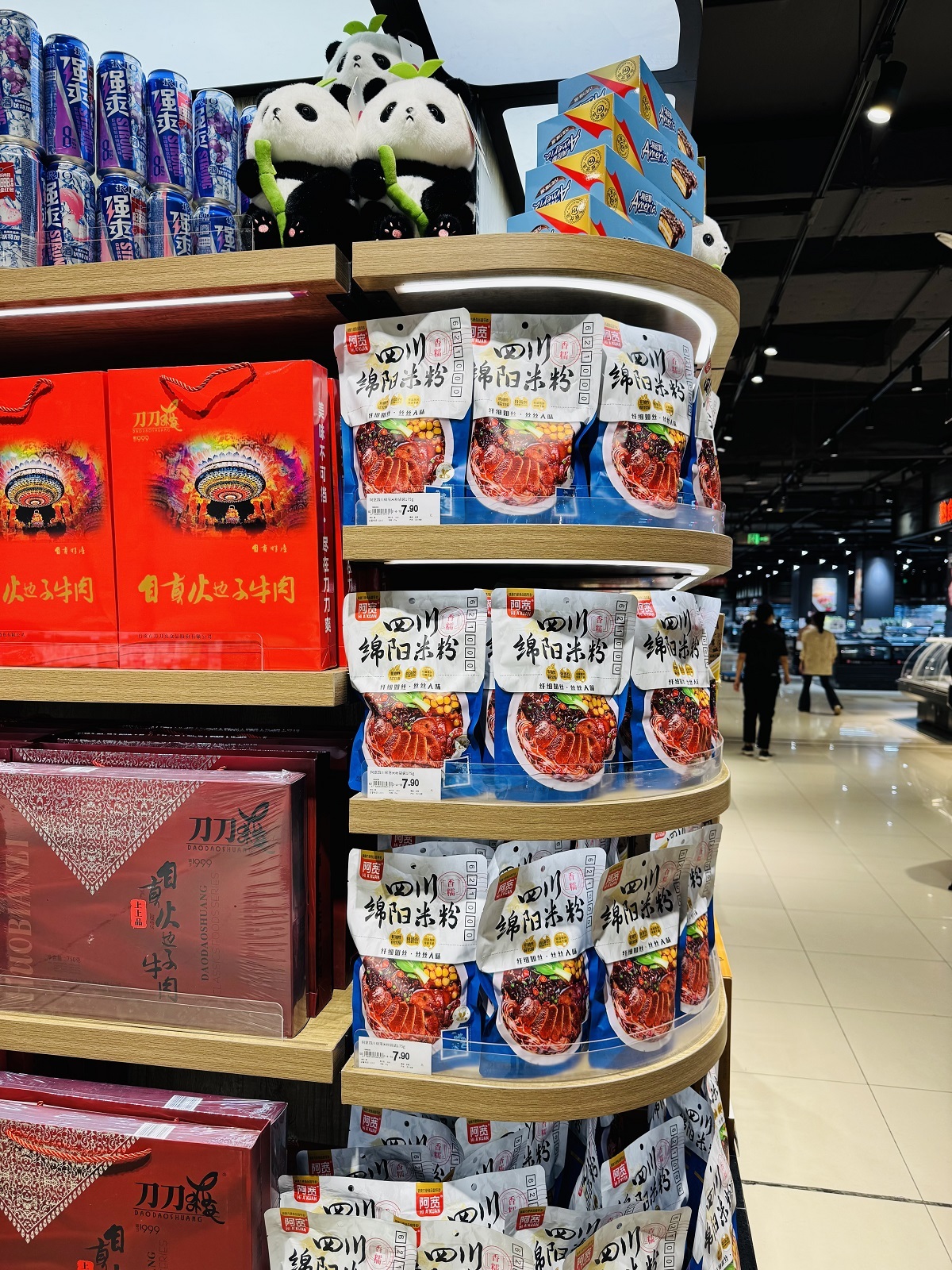 在熟食区,每个货架都上演着“舌尖上的四川”——阿宽四川绵阳米粉、冷吃兔、八大怪等特色川味食品仿佛让人一秒穿越回清晨的街边老店。