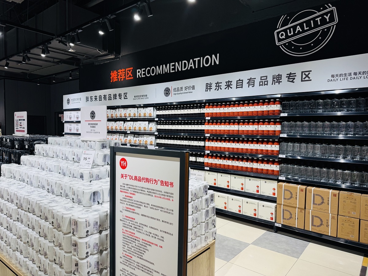 走进胖东来专区,DL精酿小麦啤酒、DL水果燕麦脆等商品铺满货柜;不远处的永辉优选专区更是汇聚了特色果干、猫牙米、无抗白凤鲜鸡蛋等多个品类的自有品牌商品。