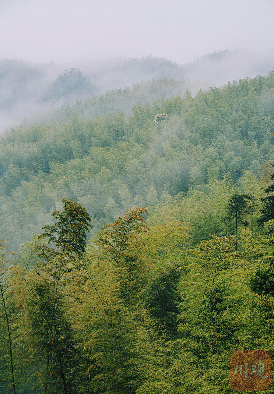 白雾飘逸环绕,林间翠绿葱葱,好一片人间仙境!