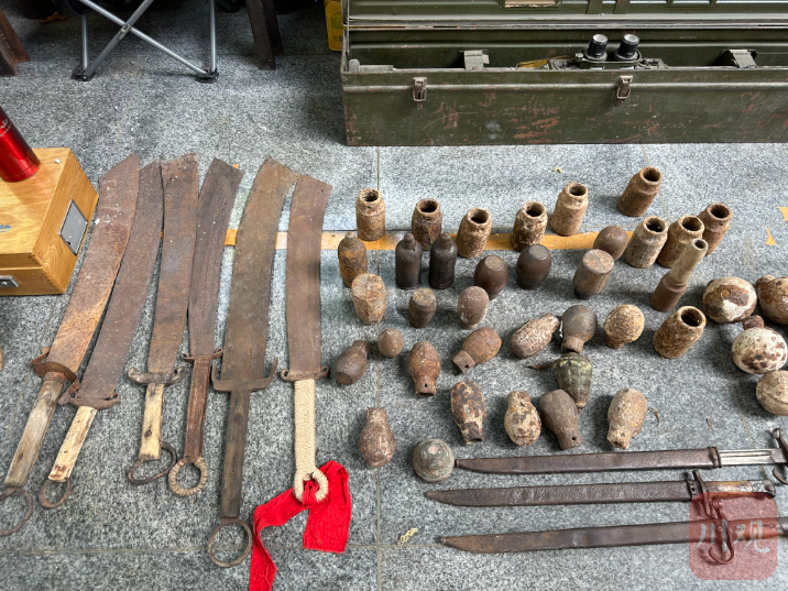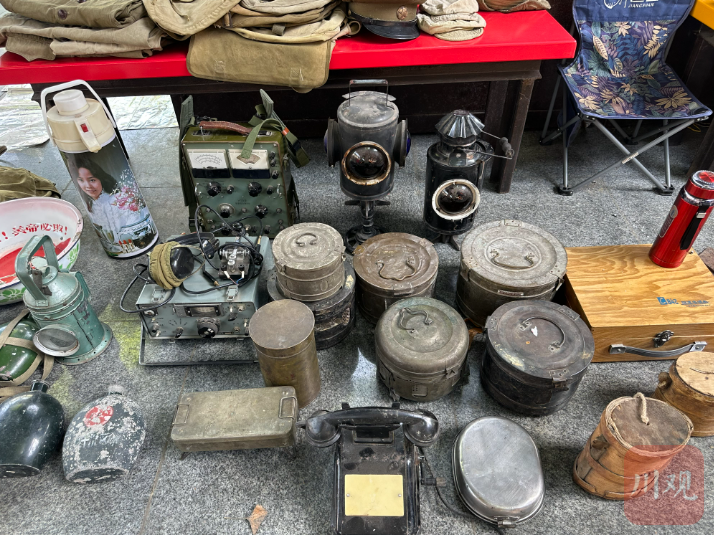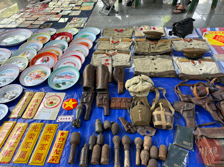 现场,不时有淘友和收藏家讨价还价,买走感兴趣的物件。成都游客李建国还专门带着孙子到现场,拿着那些军号、手雷给孩子上了一堂生动的革命教育课。