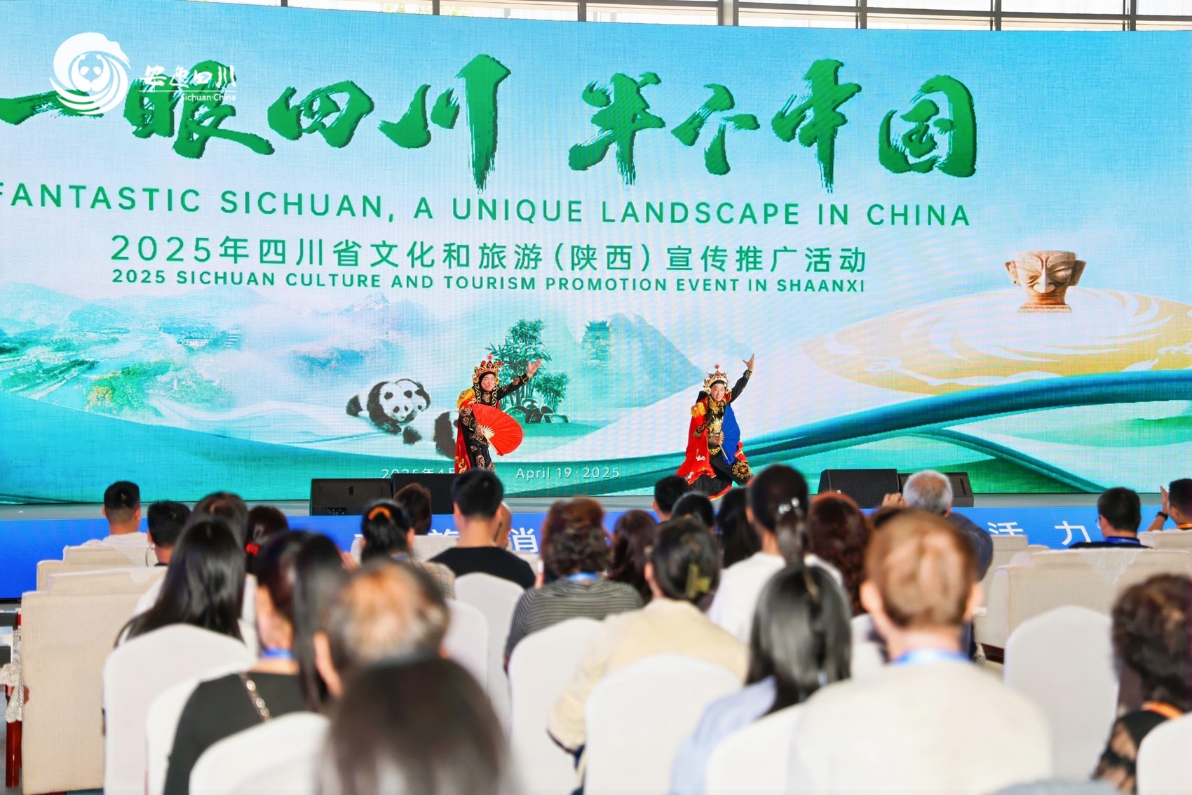 4月19日,2025西安丝绸之路国际旅游博览会主舞台上,四川省文化和旅游宣传推广活动热闹举行,发布“安逸四川·乐在五一”十条精品线路和丰富假期惠民政策,向游客发出“五一”游四川的邀约。
