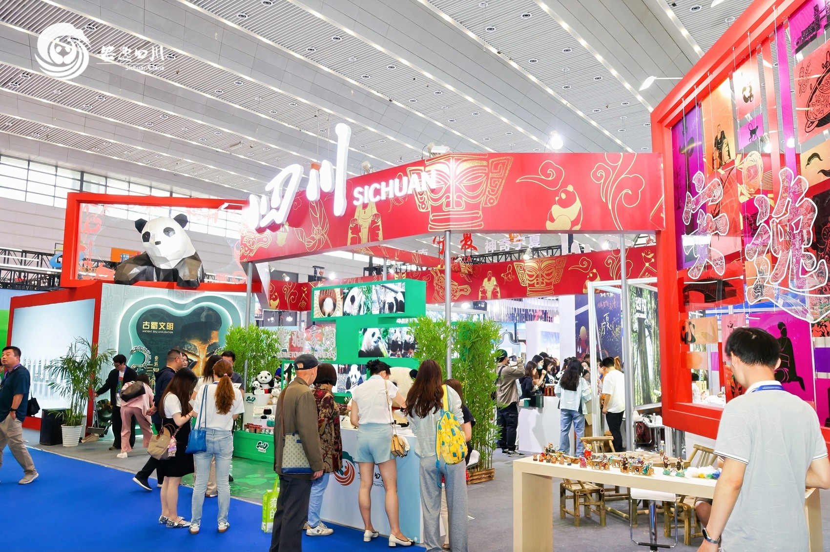 位于1号馆内的四川文旅展区,以“一印一景·钤记天府”为设计理念,融入大熊猫、三星堆、剪影等四川代表性元素,构建出错落有致、层次分明的立体几何空间,交织展示“天府之国”“熊猫家园”“古蜀文明”“安逸四川”四大文旅名片。