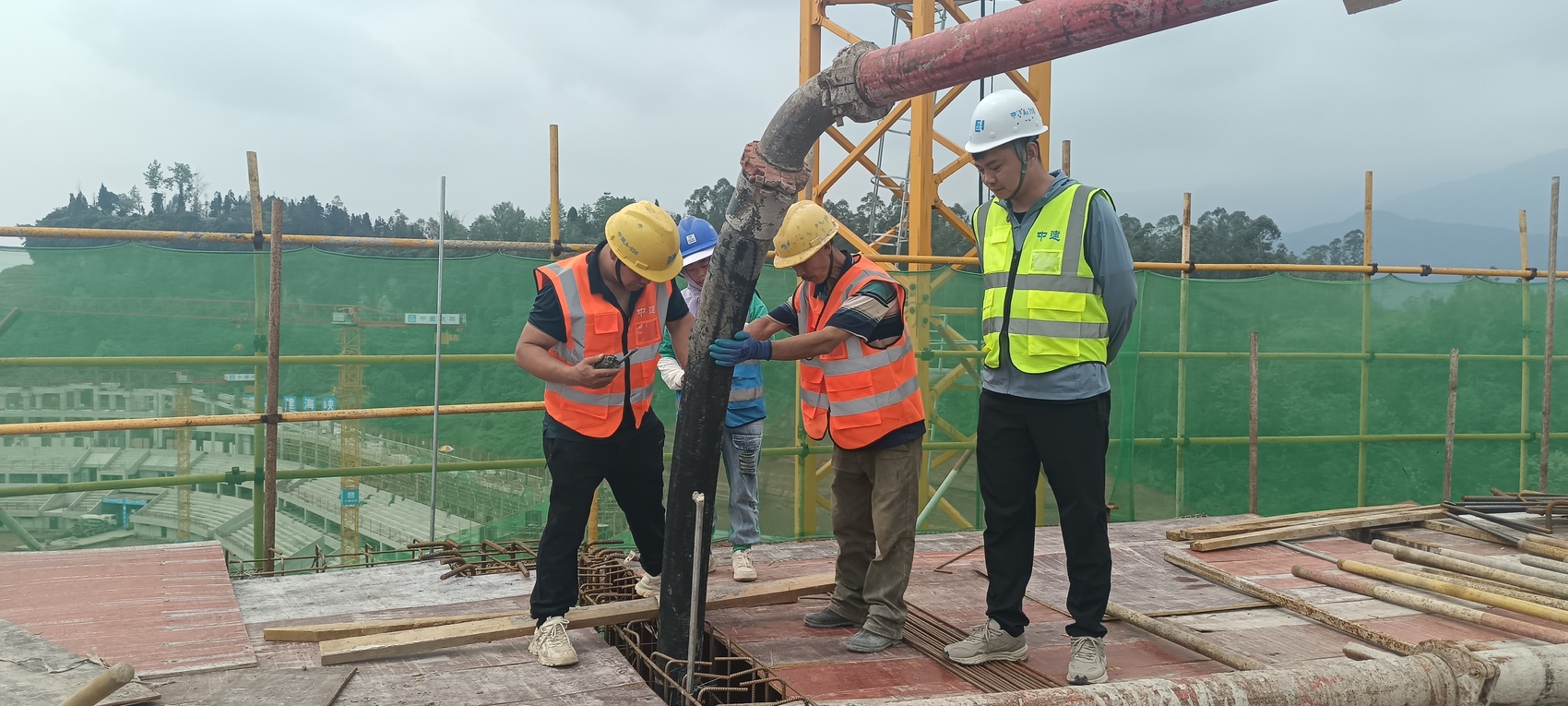站在距离地面51米的顶层屋面施工现场,10名头戴安全帽、身系安全绳的工人如同“空中舞者”,在钢筋丛林中穿梭。他们手持振动棒,紧盯着泵管末端的混凝土流速,正在准备进行振捣作业。“注意高度!保持浇筑面均匀!”对讲机里传来技术负责人的指令声,地面监控室的数字化三维模型正同步更新着浇筑数据。