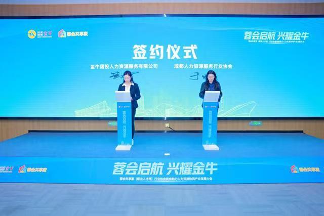 在会上,成都人力资源服务行业协会发布了“蓉会共享家”全链条服务计划,强化以党建引领深化政企协同。协会与金牛国投人力资源服务有限公司签署合作协议,共建人力资源产业生态新格局。