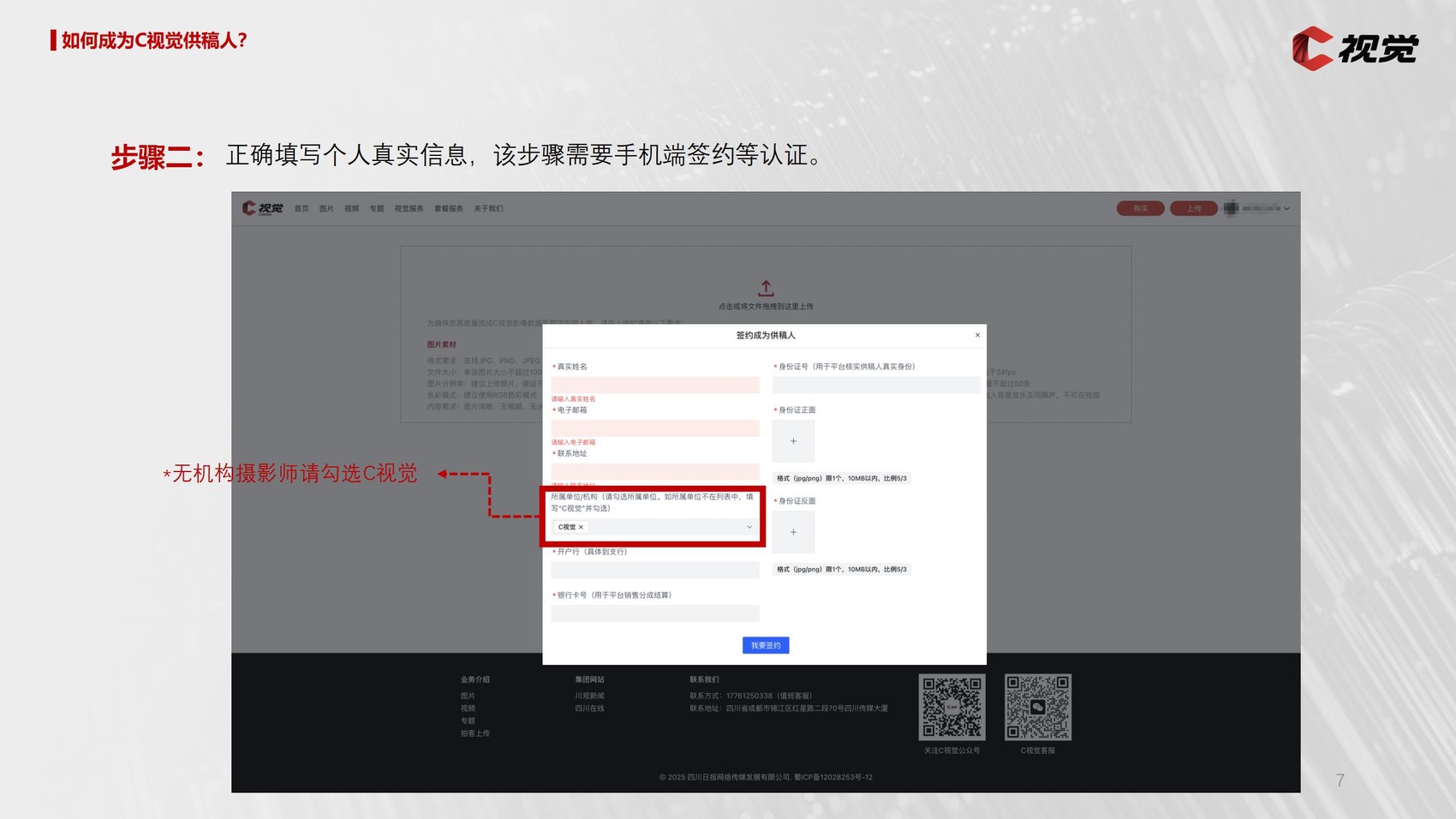 2、C视觉平台根据平台规则向供稿人(包含供稿人指定的创作者)进行销售结算,您须提供与其在C视觉平台账户相对应的经实名认证的【支付宝账户】【微信账号】和/或【银行卡账户】(银行卡开户证件信息必须与您在C视觉平台实名签约所提供的实名认证信息完全一致),并确保账户的真实性和有效性,若因您提供的信息不实或有误导致无法提现的,由此产生的一切损失由您自行承担。