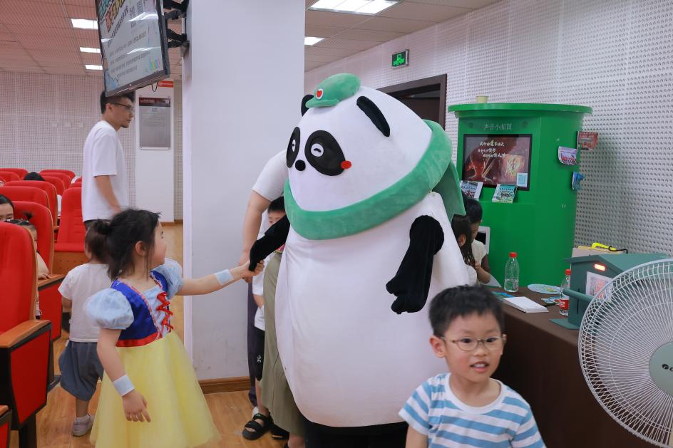 邮政熊猫YOYO人偶与孩子们互动。(武侯区图书馆供图)