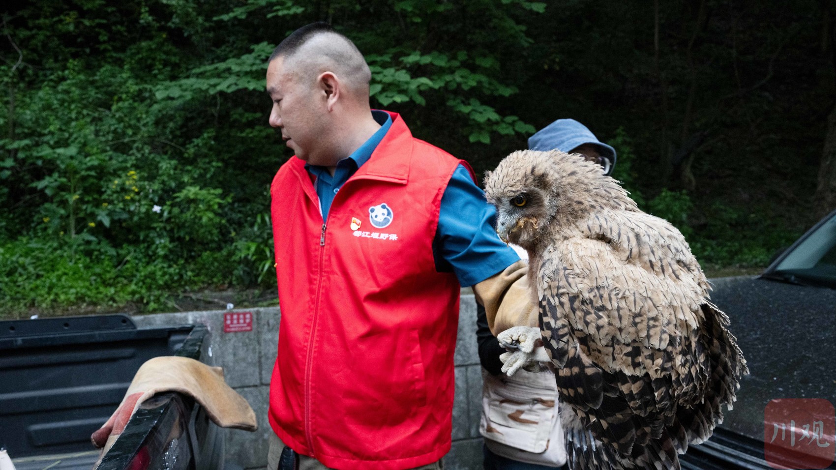 都江堰市规划和自然资源局工作人员放归黄腿渔鸮雏鸟。