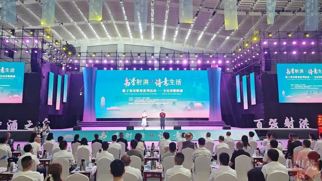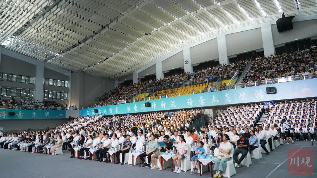 新落成的射洪河东体育馆兼具运动活力与文艺气息,500余名学生现场赛诗,数千名党员干部和各界群众代表齐诵《登幽州台歌》,重温经典,致敬先贤。现场诵读声、欢呼声、掌声此起彼伏,俨然一片诗的海洋。