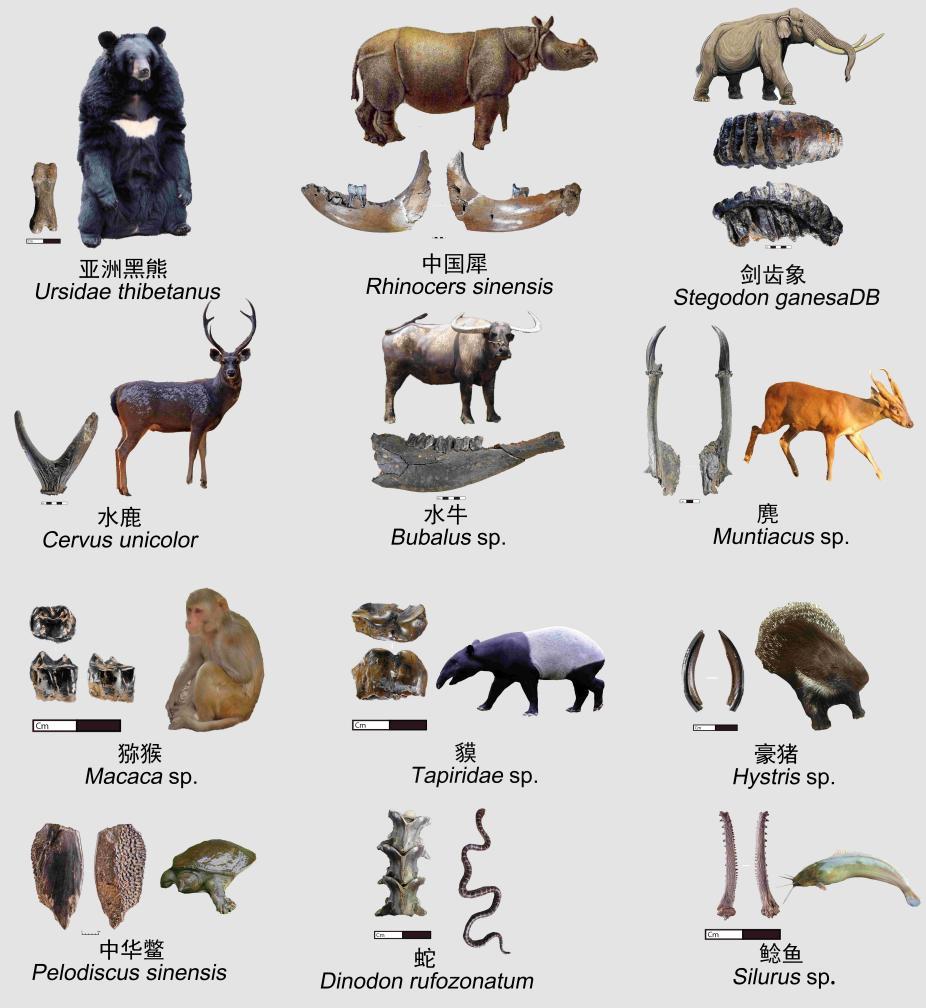 陆生动物:熊、剑齿象、中国犀、水鹿、水牛、麂、猕猴、豪猪、貘等
