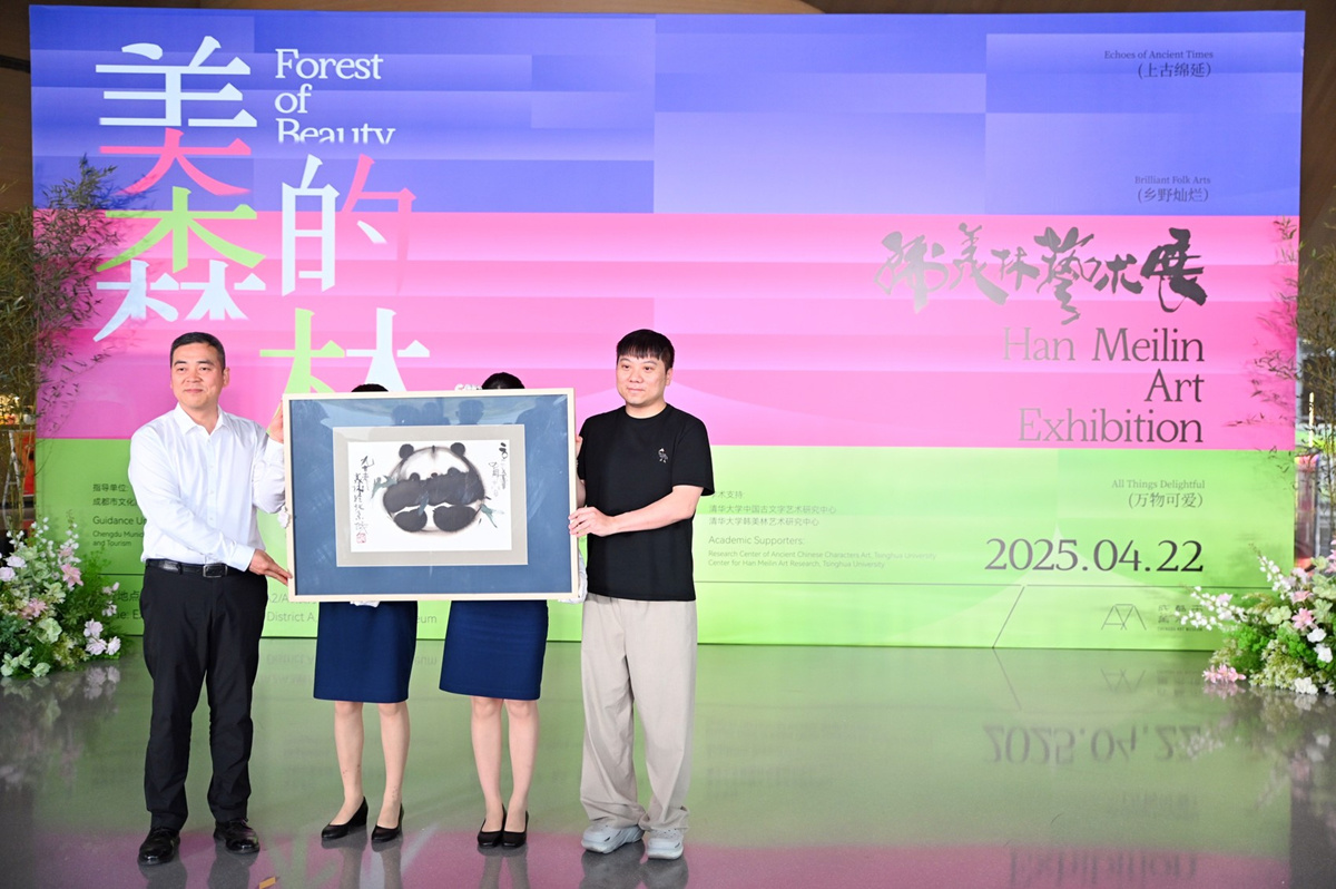 4月21日,“美的森林——韩美林艺术展”在成都市美术馆A区启幕,展览将持续至7月。开幕仪式上,韩美林艺术基金会现场向美术馆捐赠了韩美林专为成都观众创作的《熊猫花花》。
