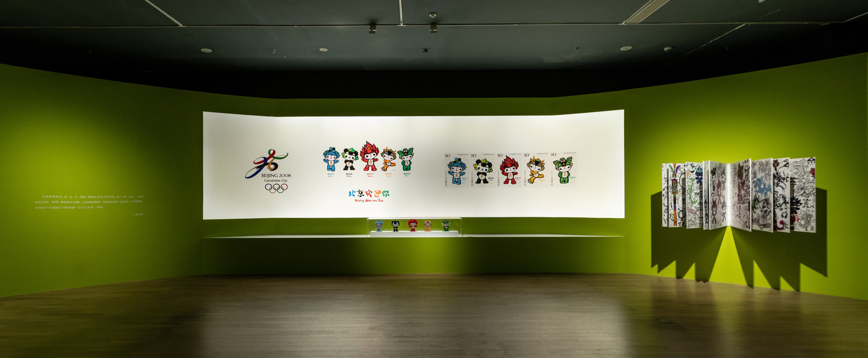展览现场,2008年北京奥运会吉祥物“福娃”背后的故事尤为引人注目。2004年,韩美林带领团队,历时8个月打磨出融合金木水火土意象的五福娃形象。本次展览通过《福娃手稿》《福娃玩偶》等展品,再现福娃的诞生历程,唤醒2008年全民奥运的集体记忆。