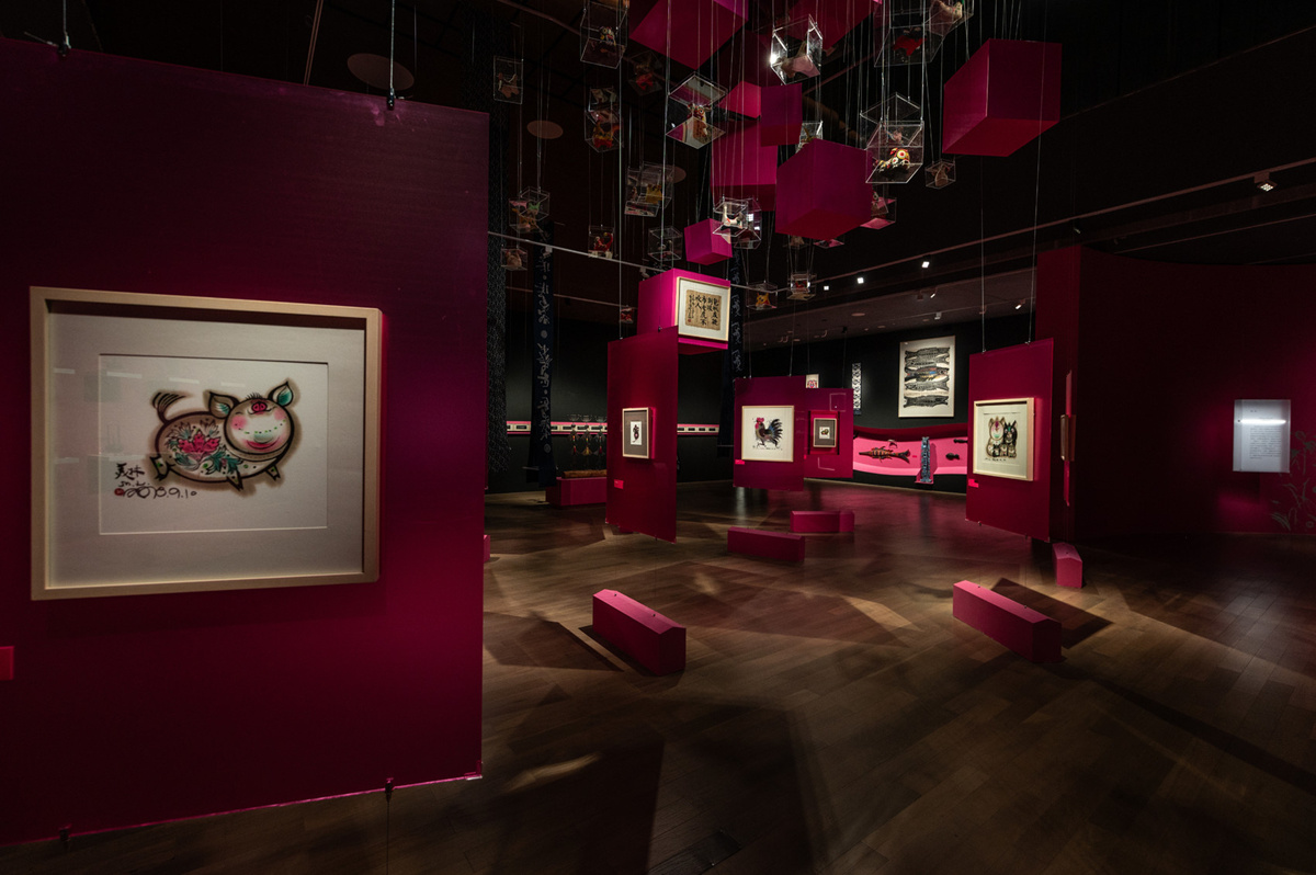 在“万物可爱”展区,错落的光影营造出森林般的沉浸氛围。观众可近距离观赏《母与子》青铜雕塑群中温情的亲子互动,亦可驻足于数十件动物水墨前,感受憨态可掬的生命意趣。特别打造的“熊猫彩蛋”专区,包含熊猫水墨画、雕塑、原版邮票等展览内容,还有百余只环保纸熊猫错落“攀爬”在竹林间,等待观众打卡。
