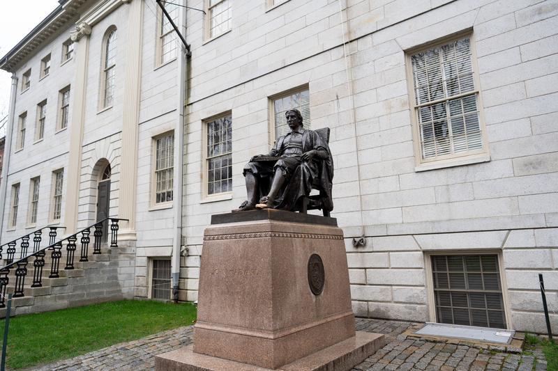 这是2024年4月20日在美国马萨诸塞州剑桥的哈佛大学校园里拍摄的哈佛大学创始人约翰·哈佛的雕塑。新华社记者刘杰 摄