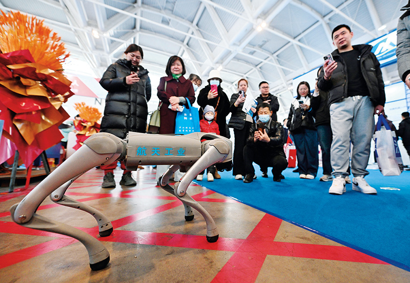 观众在第 21 届中国(天津)国际装备制造业博览会上参观一款四足机器人(2025 年 3 月 6 日摄) 赵子硕摄 / 本刊