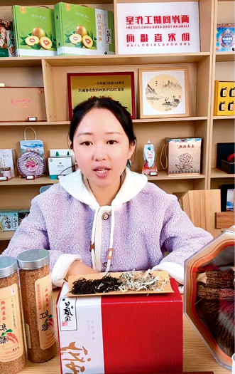 白鹿镇白鹿顶村党组织带头人后备干部陈世曦通过抖音助农直播间推介农特产品。供图/彭州组