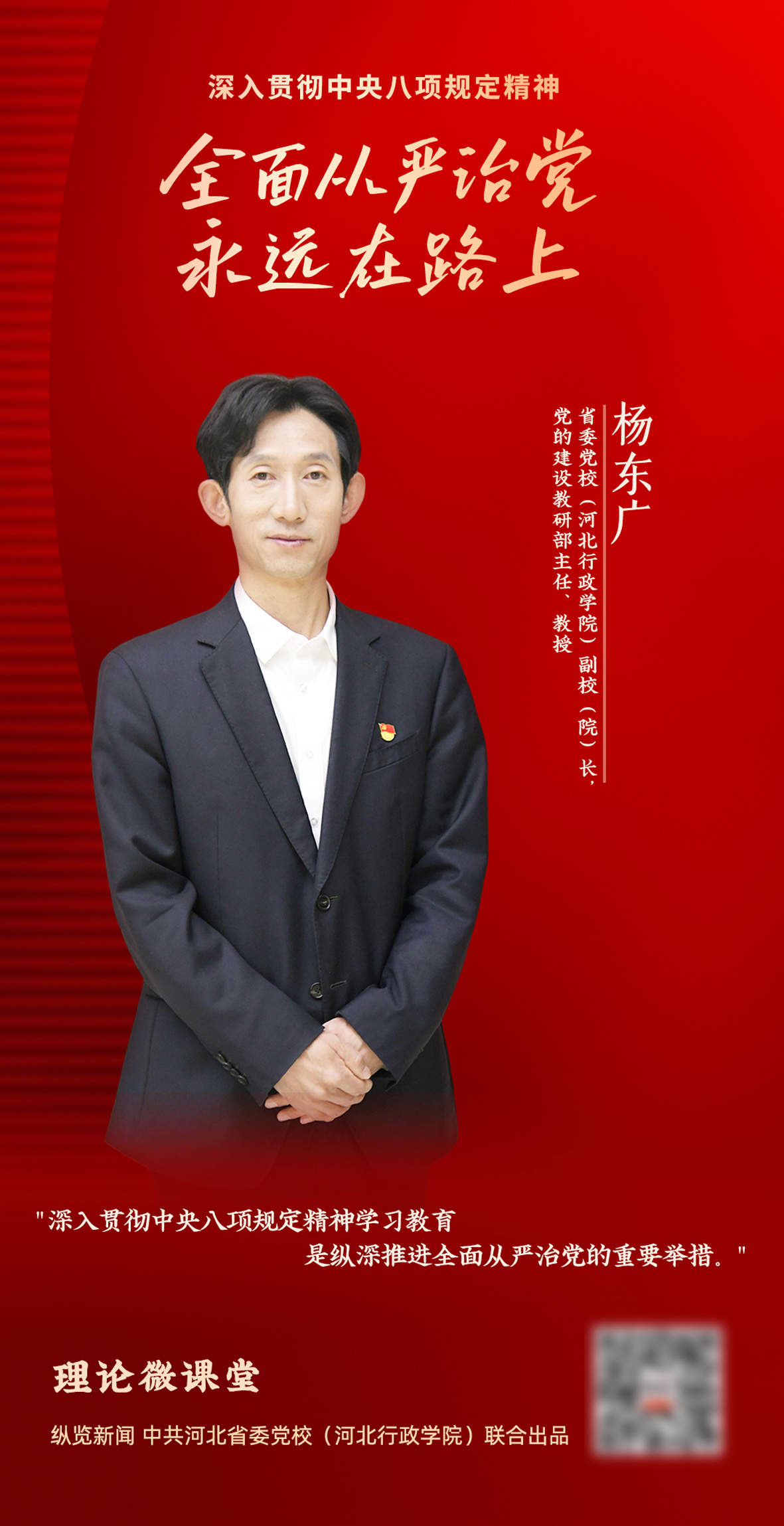 深入贯彻中央八项规定精神学习教育,是习近平总书记亲自点题、亲自部署的一项重要工作,也是2025年党建工作的一项重点任务。纵览新闻携手省委党校(河北行政学院)推出“理论微课堂”系列视频《深入贯彻中央八项规定精神》,邀请5位专家从不同层面进行深入解读。为什么说这次学习教育是纵深推进全面从严治党的重要举措?第二期,一起来看省委党校(河北行政学院)副校长,党的建设教研部主任、教授杨东广主讲的《全面从严治党永远在路上》。