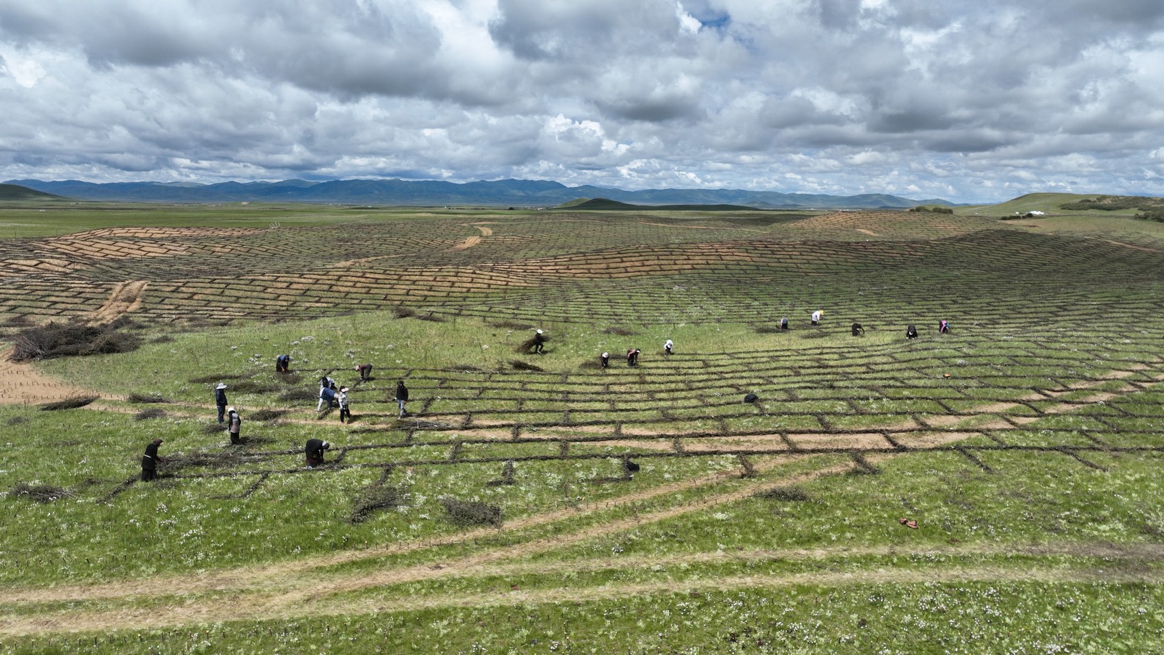 若尔盖县辖曼镇治沙现场,群众正编织高山柳沙障。 若尔盖县融媒体中心供图 (资料图片)