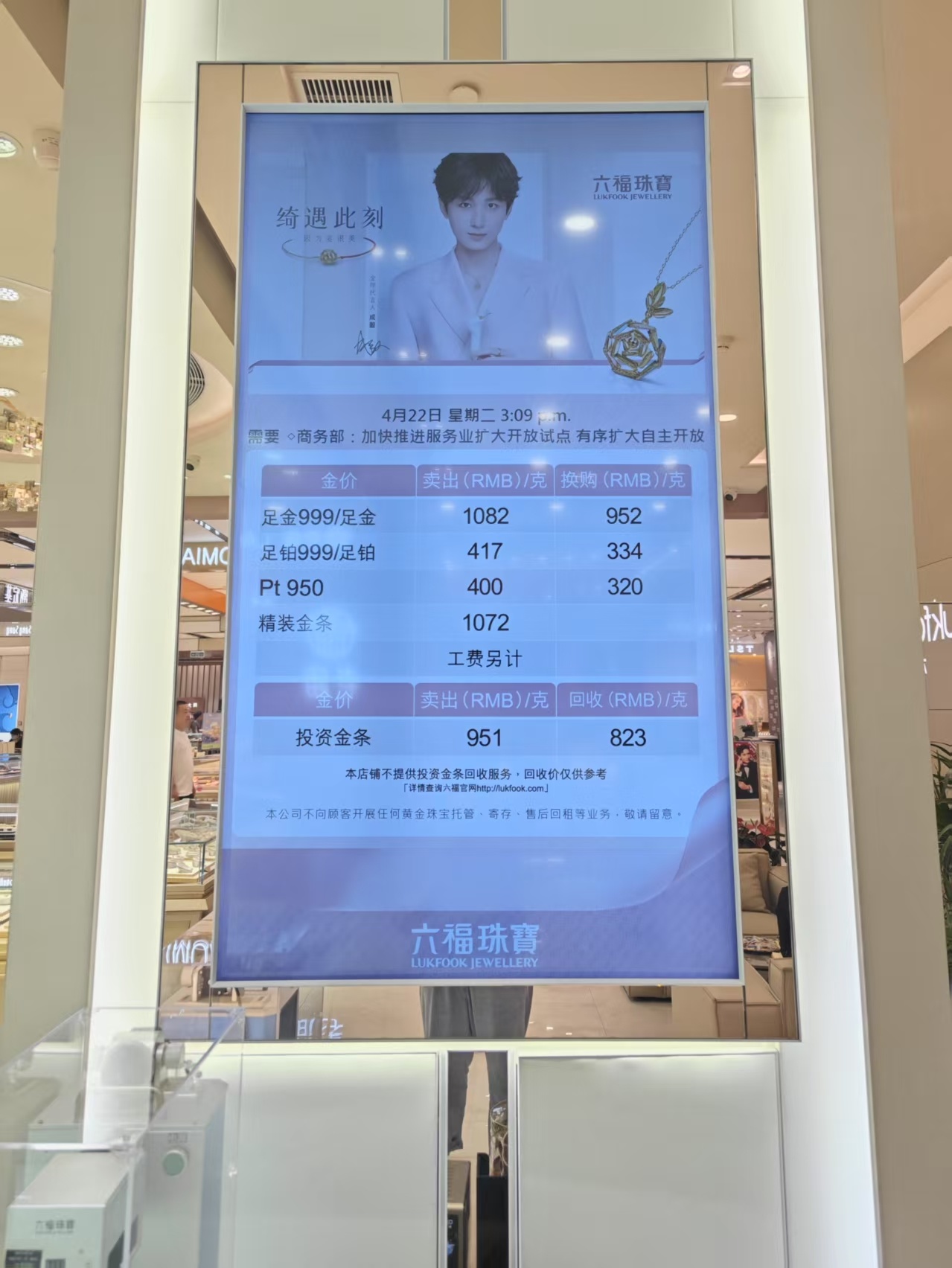 记者走访成都市区多家商场发现,品牌金饰价格不断创新高,截至4月22日16:30,周六福、周大福、六福珠宝等多家品牌足金首饰价格,均达到1082元/克。