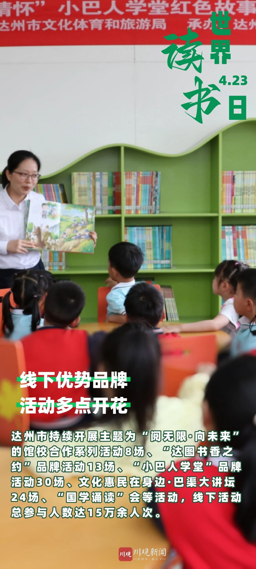 2024年,达州市持续开展以“阅无限·向未来”为主题的馆校合作系列活动8场、“达图书香之约”品牌活动13场、“小巴人学堂”品牌活动30场,文化惠民在身边·巴渠大讲坛24场、经典电影展播22场,“国学诵读”会等活动,线下活动总参与人数达15万余人次。