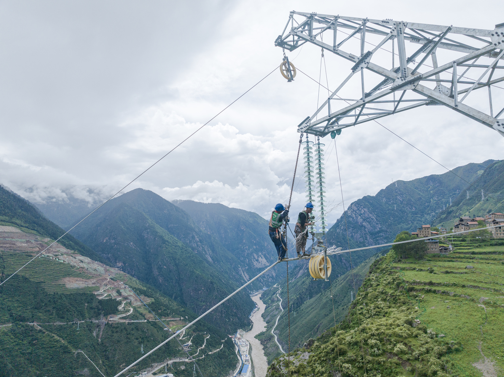 电力工人在高山峡谷间搭设输电线路。 国网四川阿坝州电力有限责任公司供图