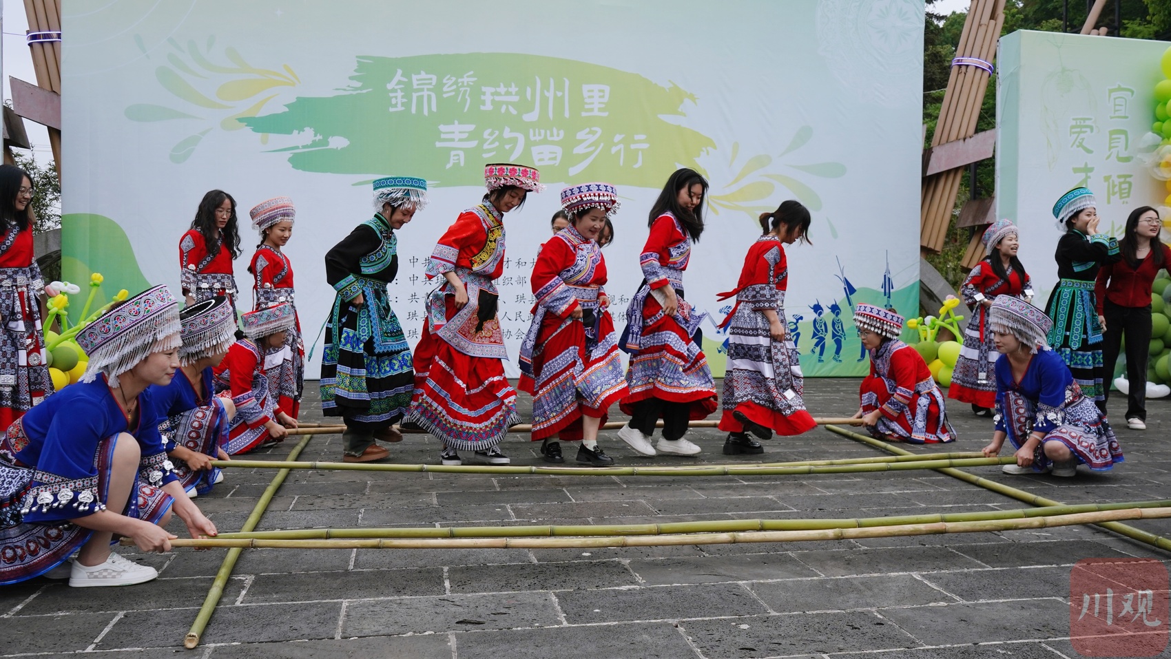 活动分为“才识珙州——苗韵悠长”“才绘珙州——蜡染丝语”“才趣珙州——笙声不息”三个篇章,大家一起体验苗族蜡染、苗家长桌宴、苗家篝火舞,还有并肩作战、扭扁担、滚铁环、竹竿舞、围炉煮茶等分组趣味活动。
