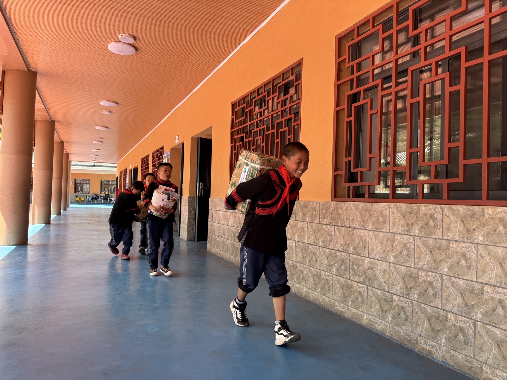 孩子们叽叽喳喳围着快递纸箱,“老师,这里面是什么?”老师拿出一把剪刀拆箱,里面整整齐齐摆放的全是彩色封面的课外书。