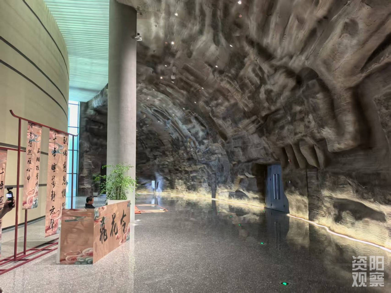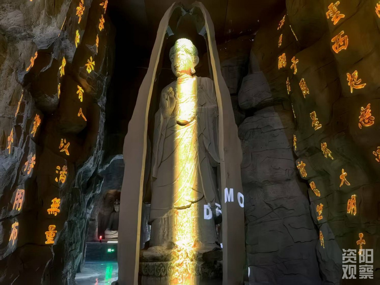 踏入展示中心,一条会“呼吸”的走廊便映入眼帘。墙面复刻茗山寺风蚀肌理,指尖触碰似能感知千年风雨;穹顶流动光影模拟崖壁,恍若唐宋山风携历史气息扑面而来。“这些设计就是要让游客一进门就沉浸在安岳历史长河中。”四川石窟文化旅游开发有限公司营销策划张国柱话音未落,前方的3D打印的紫竹观音便随着音乐光影变幻四季:春披新绿、夏绕荷影、秋覆金叶、冬落白雪,每一季都赋予观音别样神韵。