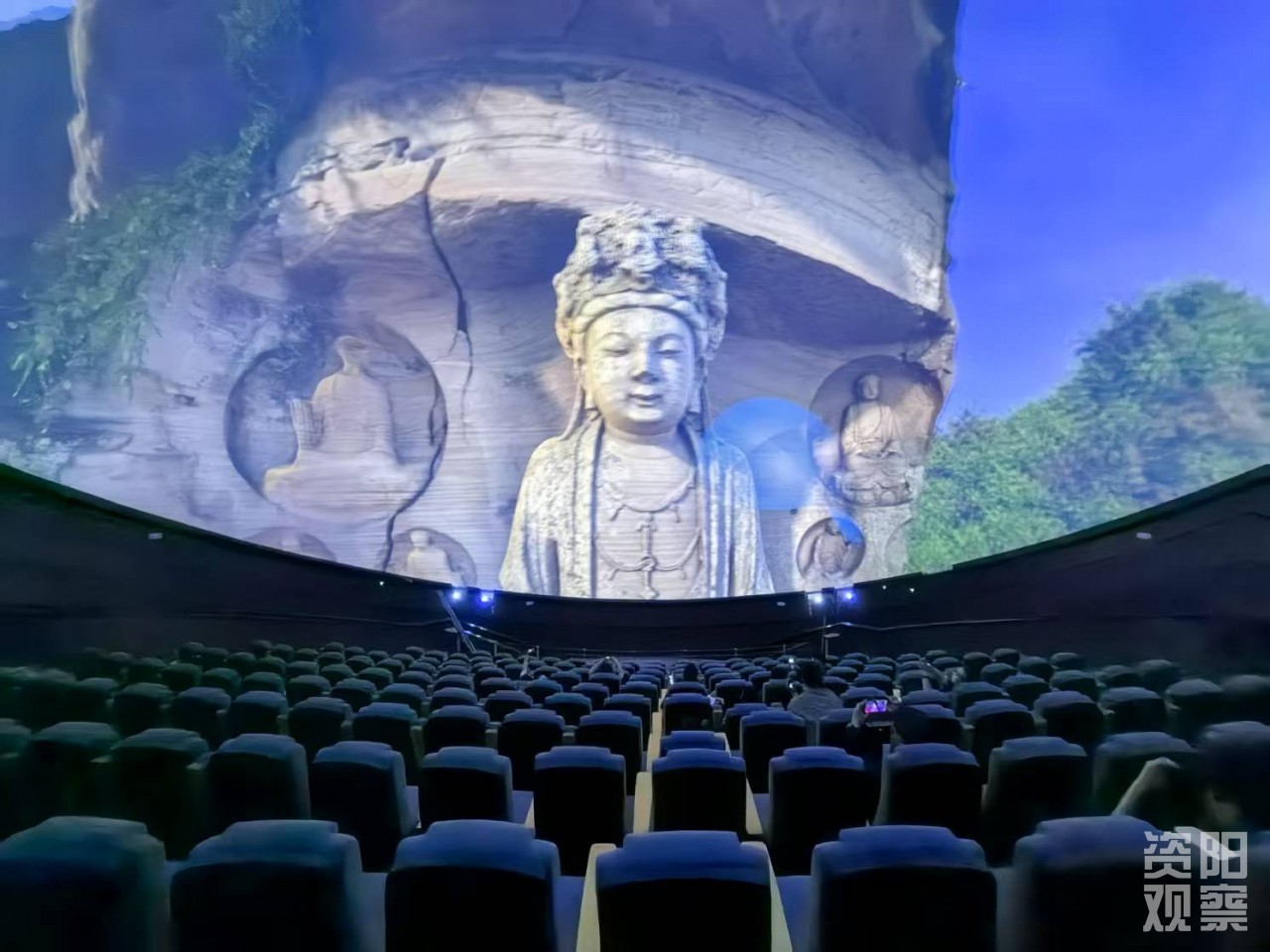而展示中心的压轴之作,当属3D8K球幕影院和Boxfilm四维沉浸影院。踏入Boxfilm四维沉浸影院,上下左右四块巨幕构成全包裹空间,8K超清画面配合360°环绕音效,可以让观众瞬间坠入历史长河。3D8K球幕影院则可以让观众躺着感受安岳石窟产生的原因和发展史,感受其独特的艺术价值。当影片播放时,仿佛置身于石窟之中,抬头便能看到精美的造像,那种震撼的视觉体验令人终生难忘。