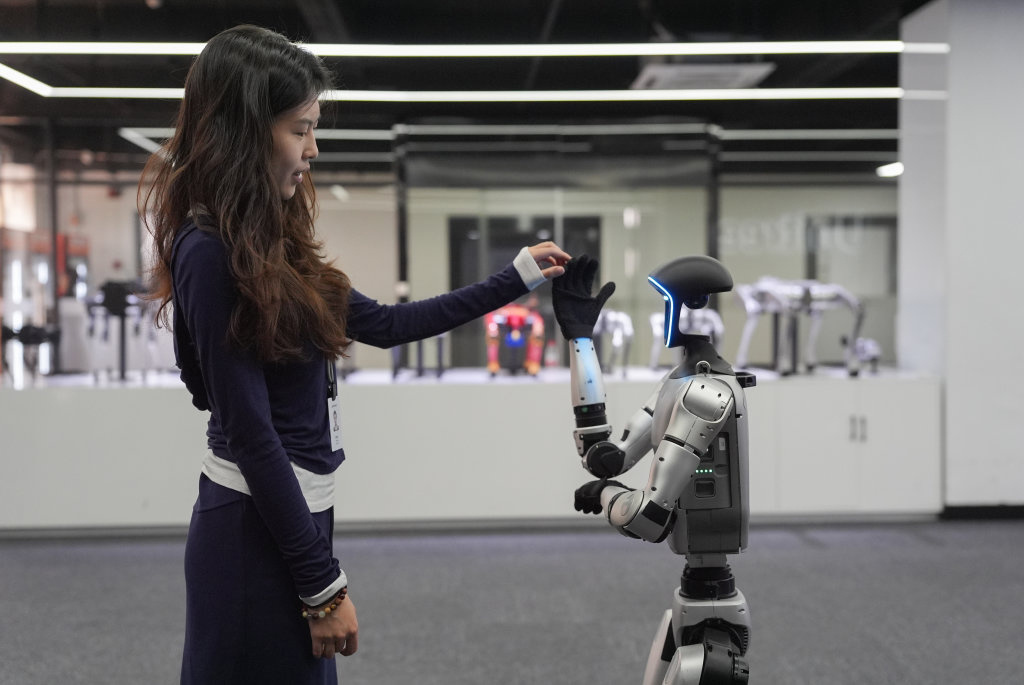 4月23日,在知名机器人公司杭州宇树科技展厅内,宇树人形机器人G1展示模仿动漫角色奥特曼的“光波”动作。这是宇树人形机器人G1本月更新的拥抱、飞吻、“光波”等动作。