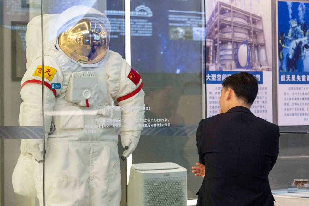 4月23日,在哈尔滨工业大学航天馆,观众观看中国舱外航天服模型。