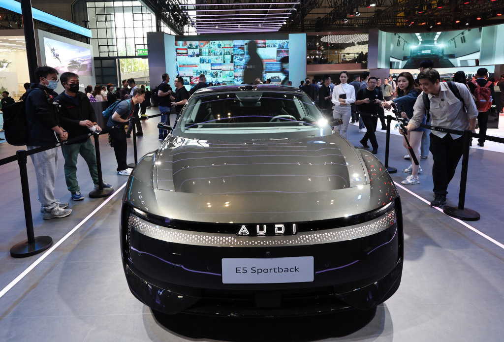 4月23日,参观者在“AUDI”品牌E5纯电汽车旁驻足观看。
