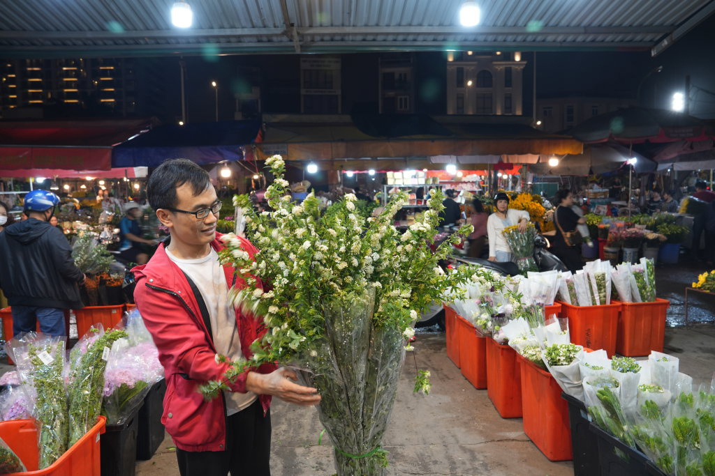 3月28日,在越南河内广霸花市,中国花商肖雷远在花铺内整理产自云南的花材“小手球”。