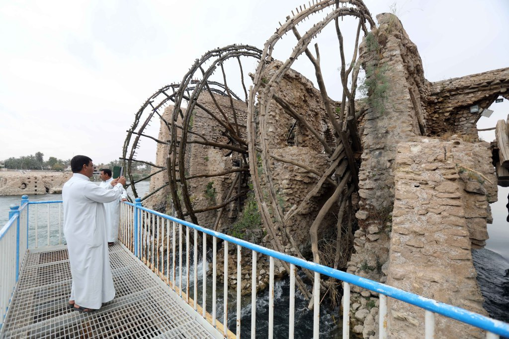 4月21日,人们在伊拉克安巴尔省参观幼发拉底河上的传统水车。