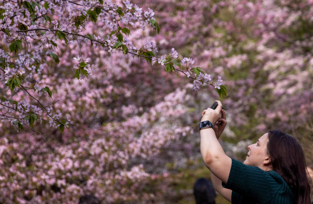 4月22日,一名女子在俄罗斯莫斯科拍摄盛开的樱花。