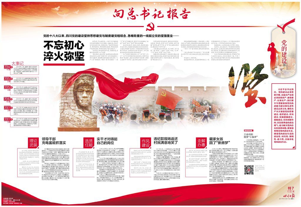 强基固本实现新提升。抓基层打基础,基层组织建设全覆盖,党员队伍结构更合理,基层基本保障大提升,“落实到基层、落实靠基层”理念深入人心。制度治党取得新进展。一手抓废改,一手抓立建,从严治党、依规治党和依法治省相结合,党的建设制度改革日益深化,党的建设制度体系日益健全,党内法规制度整体效应日益凸显。“五位一体”着力深耕,党风政风持续优化。“我们党的好干部又回来了。”在人民群众点赞声中,四川的政治生态发生着可喜变化。不忘初心、不改本色。在最危难的关头,在最需要的地方,一座座坚强的堡垒立了起来,一个个坚毅的身影站了出来,一声声坚定的回答响了起来。奋起的决心、庄重的承诺,化作那一抹红。这抹红,是抗震救灾一线猎猎飘扬的党旗;这抹红,是脱贫攻坚战场熠熠闪光的党徽;这抹红,是发展道路上最执着的奋斗;这抹红,是对人民群众心底期盼的最真回应。从96年前的南湖红船走来,中国共产党人始终不忘初心,同人民想在一起、干在一起,引领承载着中国人民伟大梦想的航船破浪前进,胜利驶向光辉的彼岸。