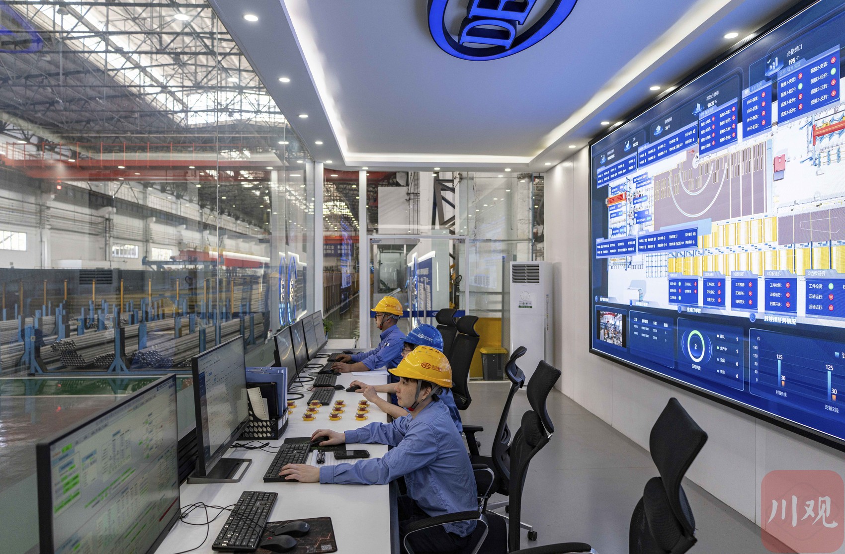 东方锅炉自贡基地蛇形管数制·智联工厂技术工人通过实时生产数据操作生产线。