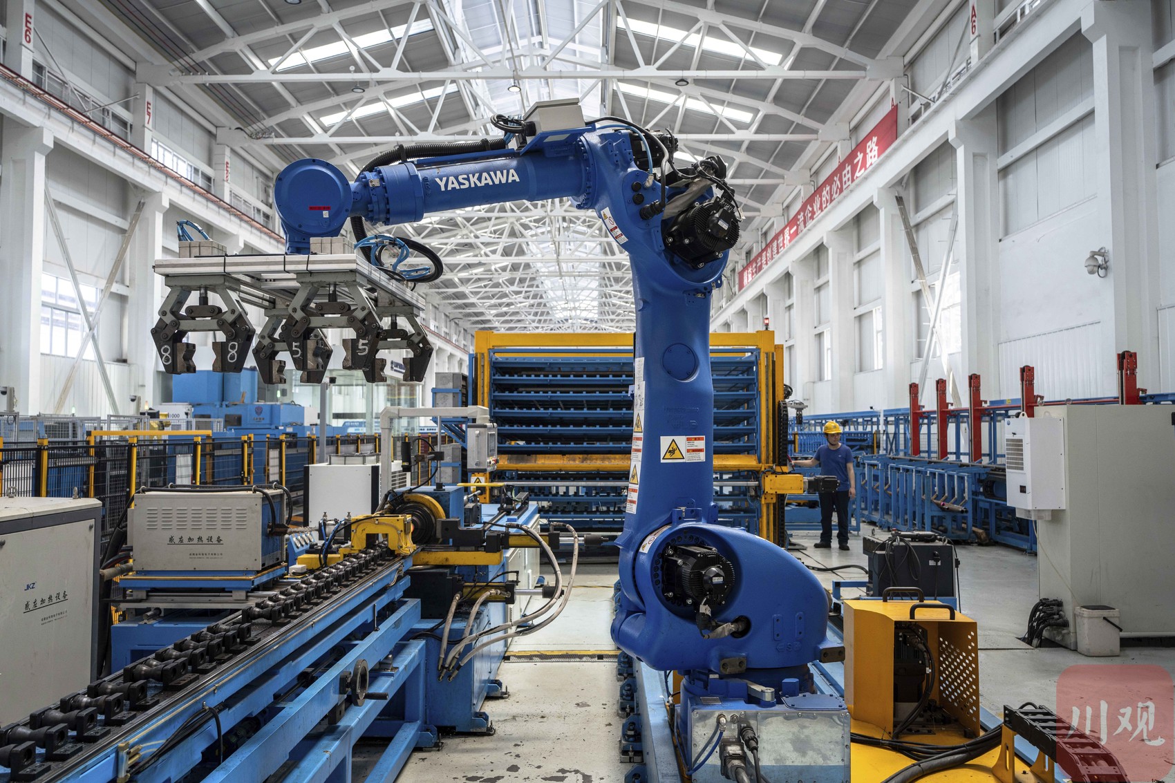 东方锅炉自贡基地蛇形管数制·智联工厂内,工人在操作机械臂。