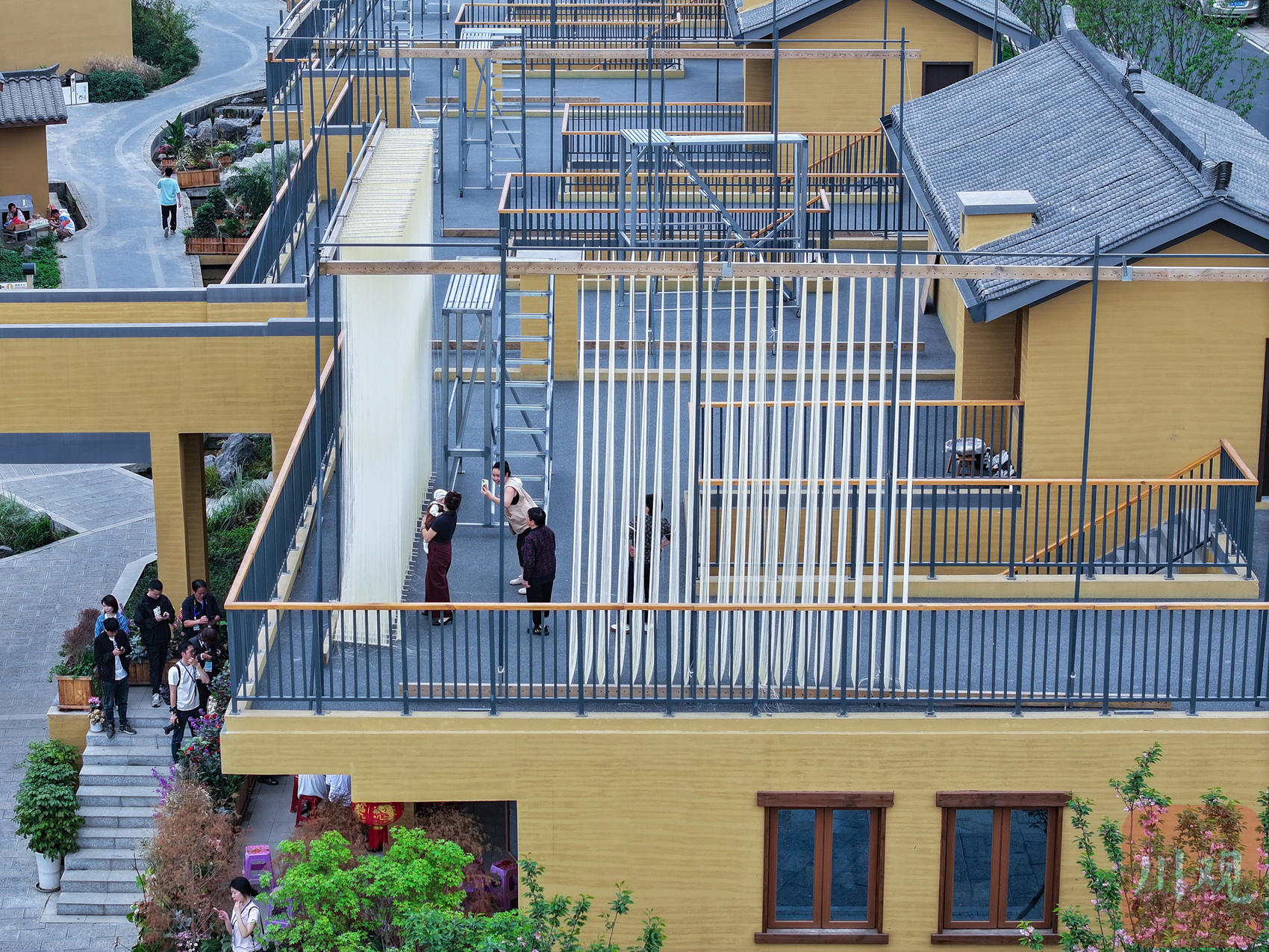 除了以“中江挂面”为拳头产品打造产销经济外,这个以挂面为生的传统村落,如今也蹚出了一条积极探寻乡村文旅的新路径。2022年,中江县委、县政府决定重新启动中国挂面村农文旅项目。经过精心打造,2024年10月,中江“挂面村”全新呈现。从2024年国庆试开园,到2025年春节系列活动带动县域形象“出圈”,再到不久前盛大举办的非遗音乐大集,中江挂面村从“专注一域”到“八方宾朋来相聚”,不断创新突破,实现了“流量”与“留量”的双丰收,也促进品牌效益、经济效益、社会效益多点开花。中江县吃面、赏景、娱乐、购物、住宿,业态逐渐丰富的“挂面村”,正逐渐成为中江一块新的“金字招牌”,成为新的文旅地标。(图据 赵明)