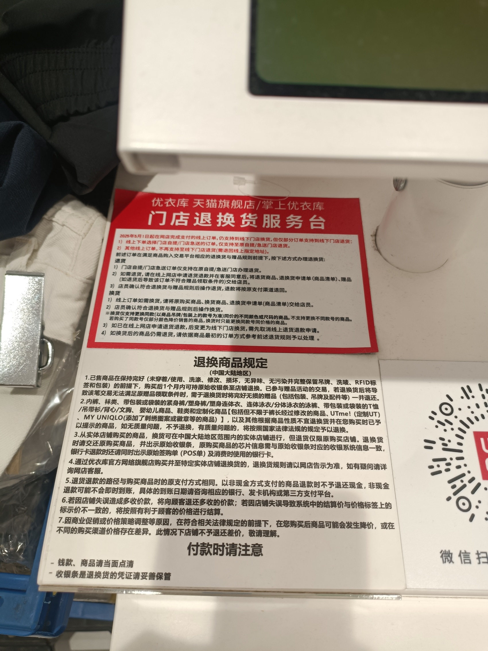 记者在成都金牛区凯德广场优衣库门店看到,收银台的显眼位置已张贴退换货商品的新规定。自5月1日起所有线上下单的商品无法拿到优衣库线下门店退货,只能寄回线上指定地址办理退货。换货规则不变,仍支持至门店办理(部分门店除外)。