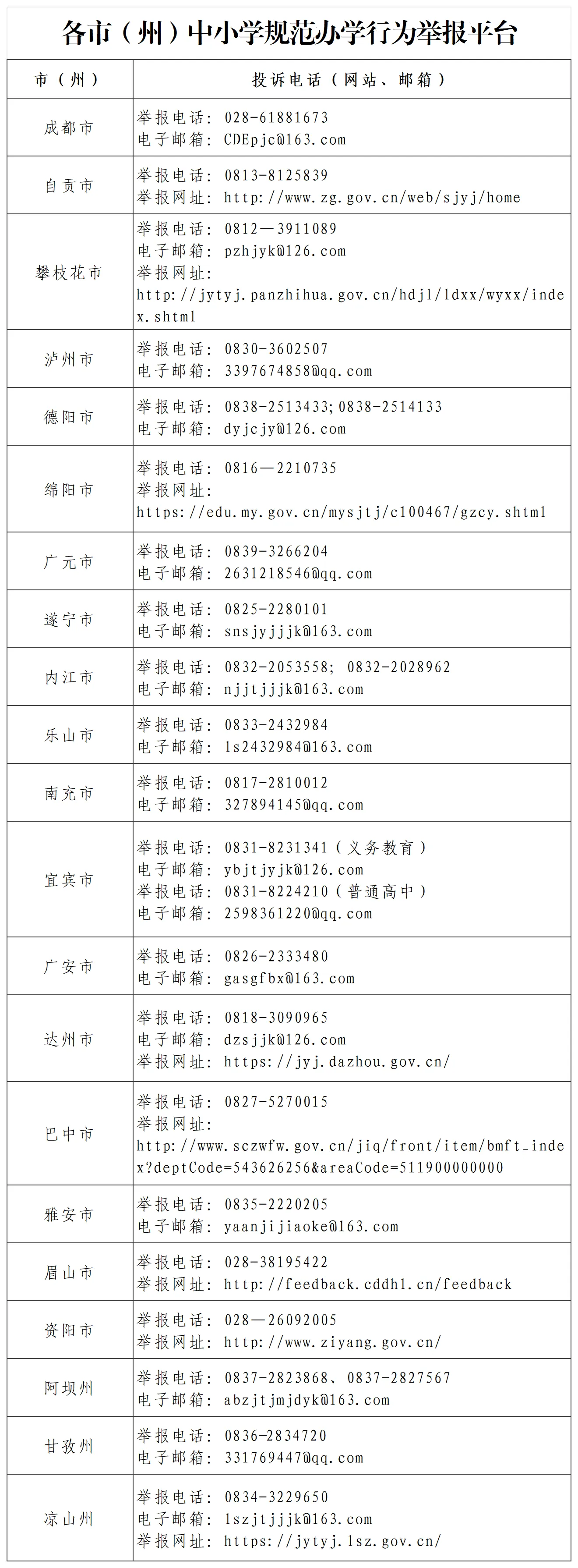为进一步规范基础教育学校办学行为,畅通举报渠道,接受社会监督,4月24日,四川省教育厅面向社会公布了各市(州)中小学规范办学行为举报平台。