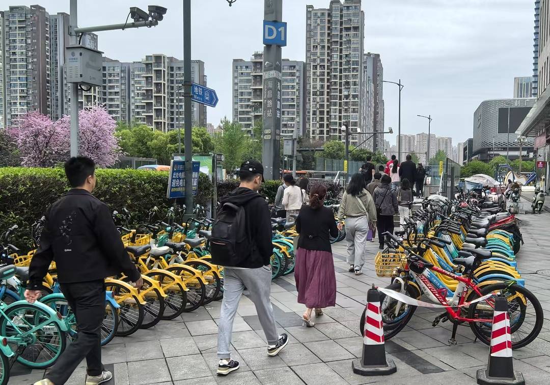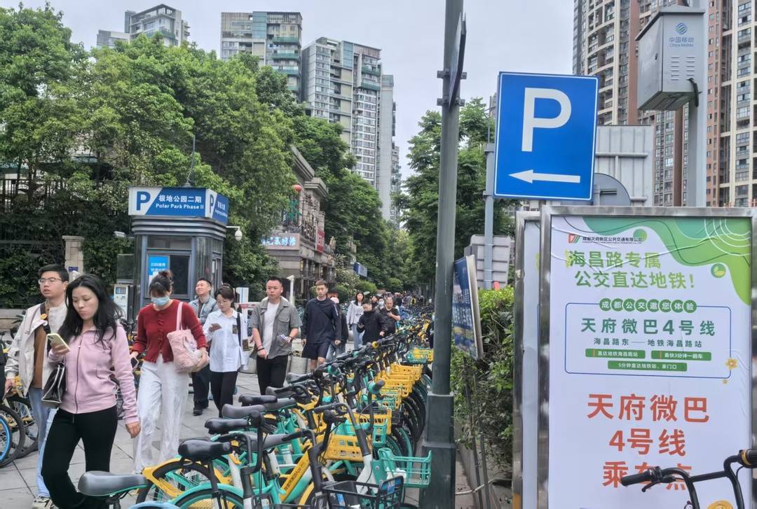 4月24日早上7时50分许,正值工作日的早高峰时段,地铁海昌路站出入口人头攒动。步行进出站的市民脚步匆匆,大家使用后的共享单车整齐排列在指定区域,乘坐天府微巴的市民有序下车,车辆即停即走。