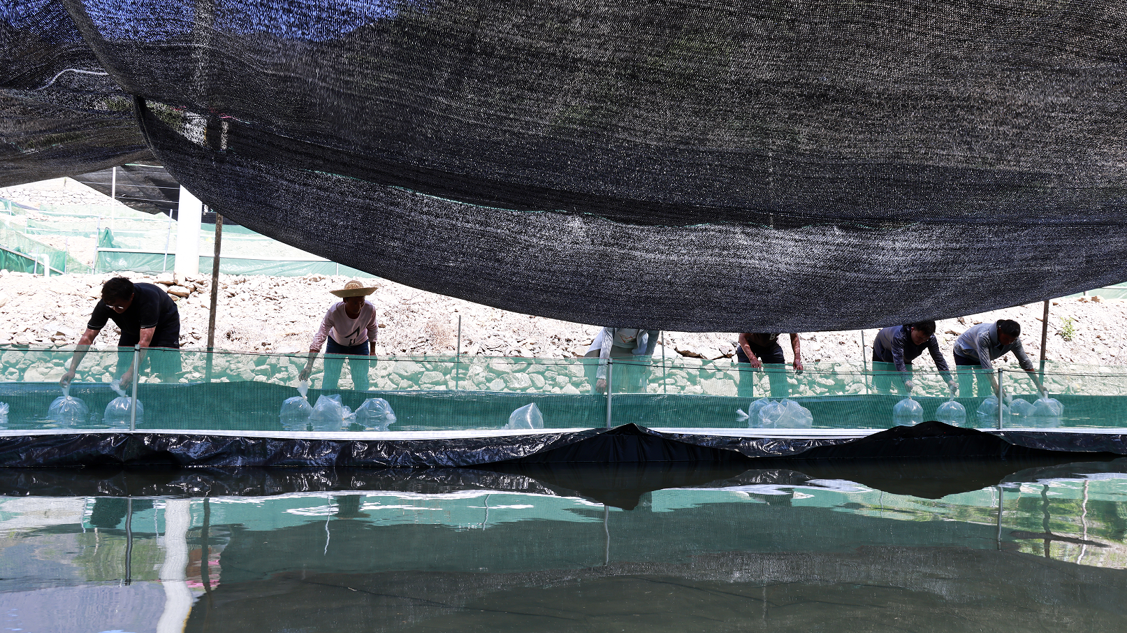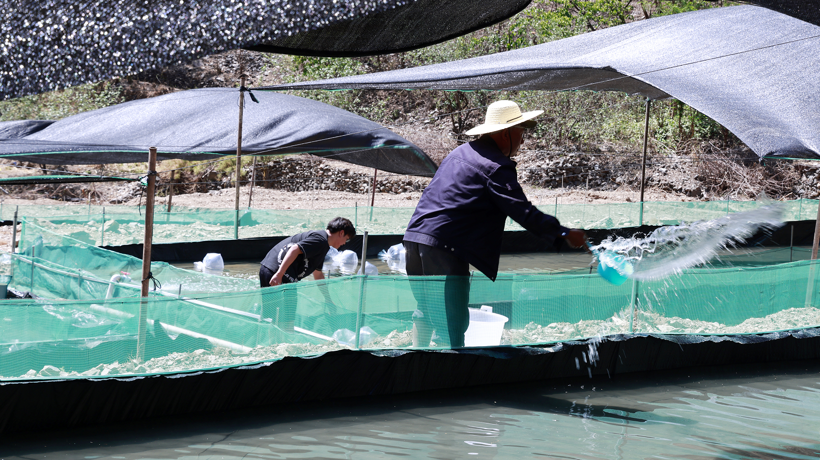芦茅林村地处金沙江畔,水资源丰富,生态环境优越,为牛蛙生长提供了得天独厚的条件。投放现场,工人们正忙碌地将牛蛙苗放入水池,黑色蝌蚪在水面上划过涟漪,缓缓游向水池中央,场面壮观。