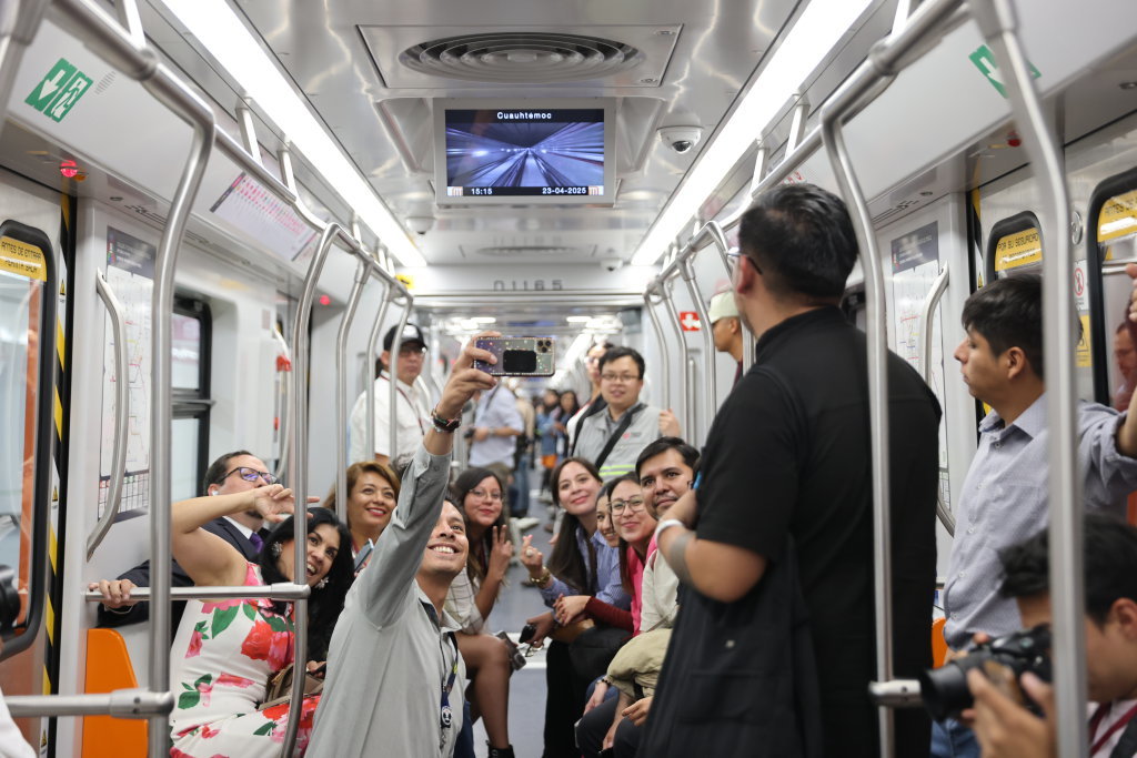 4月23日,在墨西哥首都墨西哥城,媒体记者在地铁新1号线列车上合影。