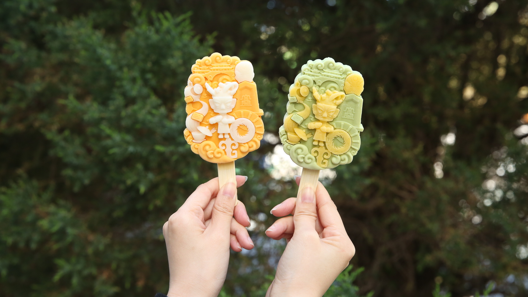 “只此成都双色雪糕”:芒果+开心果双色,融入太阳神鸟、青铜立人等文物元素,九眼桥、宽窄巷子等地标跃然“糕”上,一口尝尽三千年成都史。